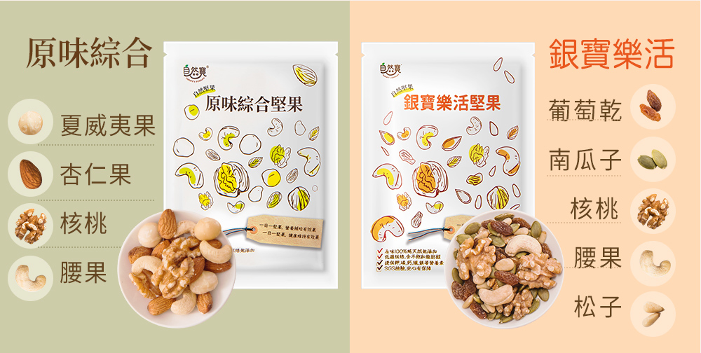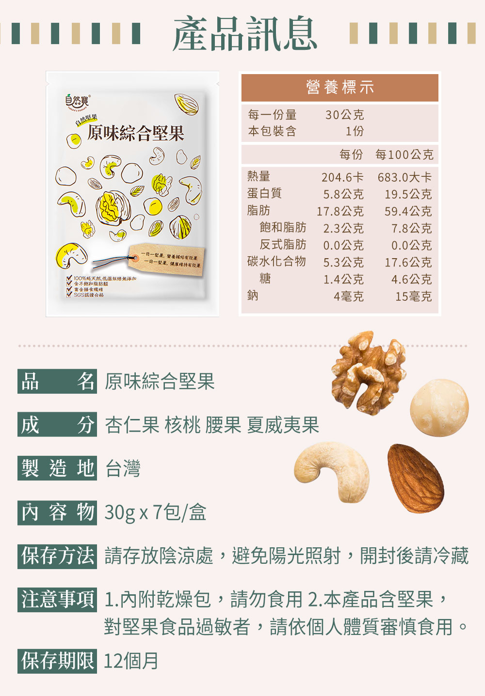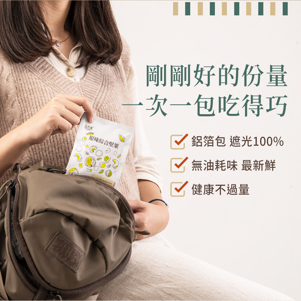 每一包都有🌰整顆的夏威夷果🌰,搭配杏仁、腰果、核桃組成🏆原味綜合堅果隨手包,富含好的油脂👍,還有各種身體所需的微量元素💪,份量幫你調整好,每天吃一包,吃得好也吃得巧!